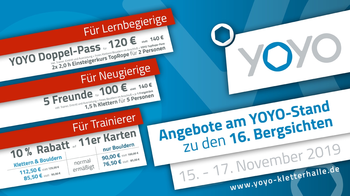 Und aktuell begrüßen wir Euch zusätzlich das ganze Wochenendebei den Bergsichten am YOYO Stand. Dort werden wir nicht nur als Informationsquelle dahersprudeln, ebenso könnt ihr bei unseren Messeangeboten direkt vor Ort zuschlagen.